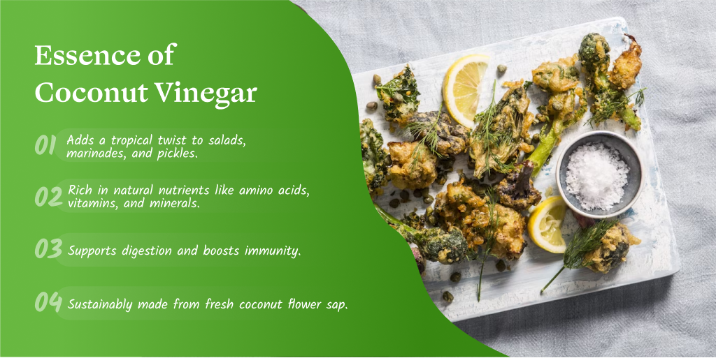 The star ingredient is sweet coconut flower nectar. Through careful fermentation and aging, it transforms into a complex vinegar full of natural flavours. You'll taste subtle sweet notes balanced perfectly with a bright acidity. Each batch is aged traditionally to develop its signature taste profile.