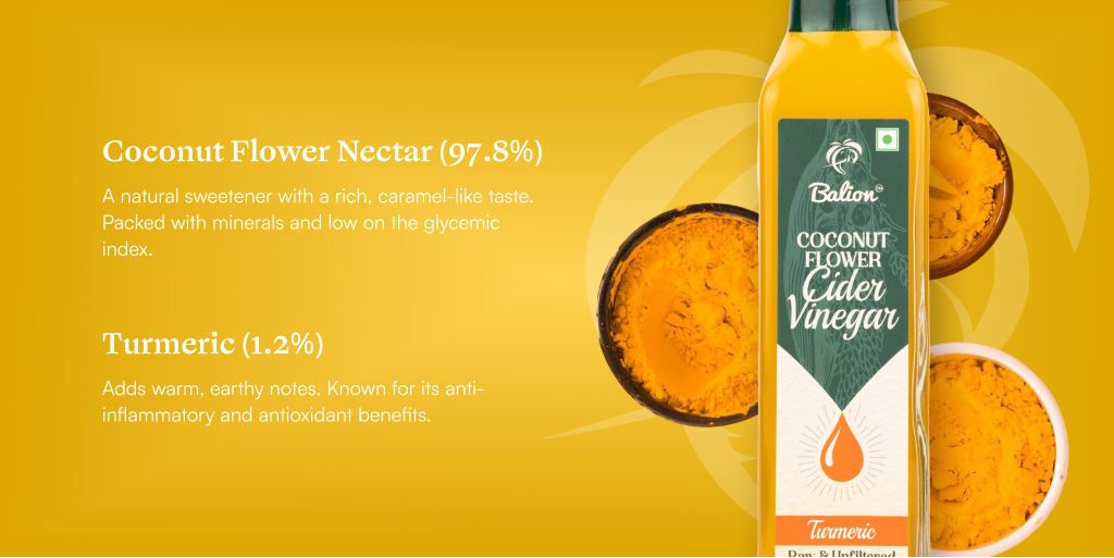 Balion Coconut Flower Cider Vinegar with Turmeric is here to add a unique twist to your cooking. It’s perfect for preserving, marinating, or seasoning your meals. Want to elevate your Goan pork vindaloo or take a modern vegan meal to the next level? It’s got you covered. Splash it in marinades, whisk it into dressings, or create probiotic-rich beverages. The possibilities are as endless as your imagination!